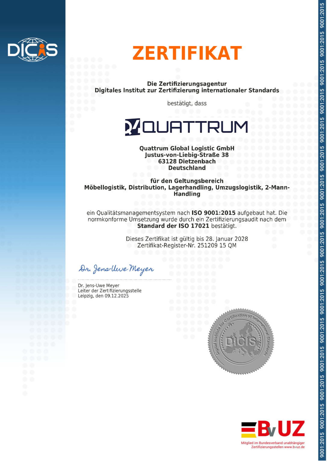Die Erlangung der ISO 9001-Zertifizierung stellt einen bedeutenden Meilenstein in der Entwicklung unseres Unternehmens dar. Sie zeigt, dass wir unsere Arbeitsprozesse konsequent an internationalen Qualitätsanforderungen ausrichten und systematisch weiterentwickeln. Alle Bereiche unseres Unternehmens haben aktiv dazu beigetragen, die erforderlichen Standards zu erfüllen und unser Qualitätsmanagement nachhaltig zu stärken.